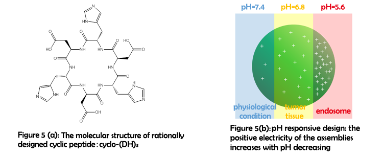 In order to improve the delivery selectivity, the function of pH-responsive delivery can be incorporated to the assemblies by substituting histidine for glycine. Usually, the acidity in tumor microenvironment is stronger than it in normal tissue due to the rapid metabolism of tumor cells6. As a consequence, the protonation extent of histidine side chain increases significantly at tumor tissue (see calculation), which facilitate the intracellular delivery of nucleic acid to the cancer cells.