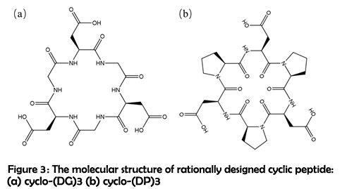 Our main objective is to construct tailorable cyclic peptide based nano-structure that can be applied to nucleic acid delivery. In order to extend the assembling strategies and make good use of the variety of amino acids, we highlight the roles of cyclic peptide sidechains in the construction of nanostructures. Inspired by the concept of click chemistry1, a cyclic hexa-peptide model with some certain reaction sites has been rationally designed (Figure 1). Three aspartic acid residues are alternately connected in the cyclic peptide, providing three symmetrically arranged carboxyl groups for further two-dimensional (2D) assembling with amino or guanidine terminated linkers. Theoretical studies as well as experiments have shown that such 2D structure will subject to the high surface energy, bending and finally forming vesicles or tubular structures (Figure 2)2.