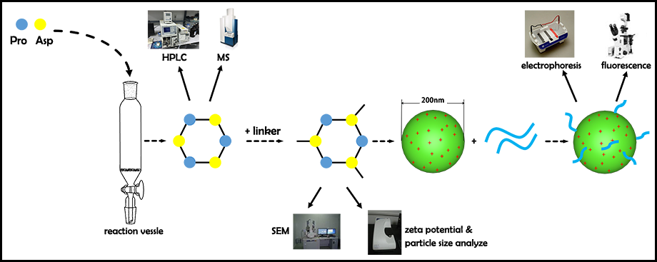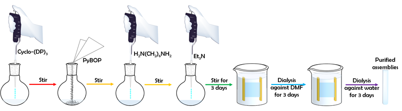 0.50 mg (0.00079 mmol) of Cyclo-(DP)3 was dissolved in 0.5mL of DMF at room temperature. Following this, 122.71 mg (0.23580 mmol) of PyBOP and 3.3 mL of DMF were added to the flask under stirring condition. Subsequently, 3.9 μL (0.059 mmol) of ethylenediamine was added to the flask, followed by the addition of 3.3 μL (0.024mmol) of TEA. The mixture was stirred for 72 hours at room temperature to produce nano assemblies.
