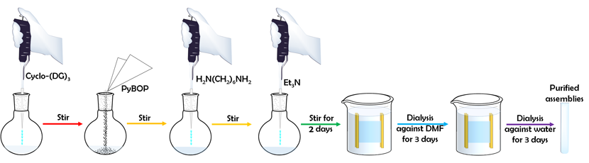 0.50 mg (0.00079 mmol) of Cyclo-(DP)3 was dissolved in 0.5 mL of DMF at room temperature. Following this, 122.71 mg (0.23580 mmol) of PyBOP and 2.3 mL of DMF were added to the flask under stirring condition. Subsequently, 6.85 mg (0.0590 mmol) of 1, 6-diaminohexane was dissolved in 1 mL DMF and added to the flask, followed by the addition of 3.3 μL (0.024mmol) of TEA. The mixture was stirred for 72 hours at room temperature to produce nano assemblies.