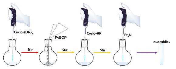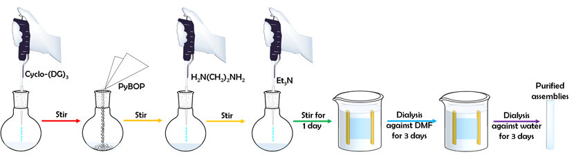 0.50 mg (0.00079 mmol) of Cyclo-(DP)3 was dissolved in 0.5mL of DMF at room temperature. Following this, 24.54 mg (0.04716 mmol) of PyBOP and 3.3 mL of DMF were added to the flask under stirring condition. Subsequently, 0.8 μL (0.01 mmol) of ethylenediamine was added to the flask, followed by the addition of 3.3 μL (0.024 mmol) of TEA. The mixture was stirred for 72 hours at room temperature to produce nano assemblies.