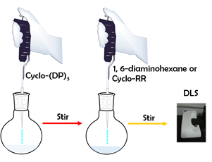 0.10 mg (0.00016 mmol) of Cyclo-(DP)3 was dissolved in 0.2 mL of DMF at room temperature. Following this, 0.74 mg (0.0024 mmol) of cyclo-RR was dissolved in 0.2 mL of DMF and then added to the flask. Another 0.37 mL of DMF was added to the reaction system. The size of the assemblies was monitored by DLS.