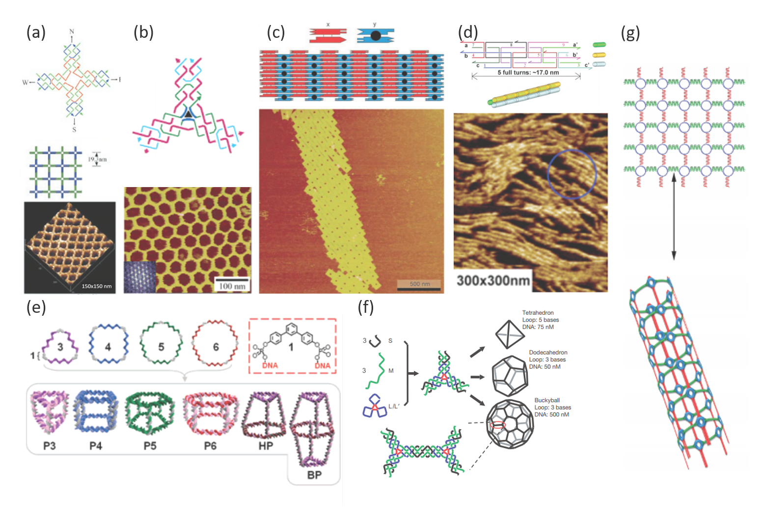 Figure 1. Examples of multi-dimensional DNA structures. (a) A two-dimension lattice assembled from cross-shaped DNAs tailed with four unpaired sticky ends. Adapted from ref 1. (b) A three-point-star DNA tile composed of three red strands, three blue strands, and one green-dark blue strand assemble into hexagonal lattices via complementary sticky ends. Adapted from ref 2. (c) A two-dimensional array containing two double-crossover molecules, X and Y. Molecule Y has an extra double-helical domain (black). The structure is formed through the cohesion of sticky ends. Adapted from ref 3. (d) Linear or 2D arrays assembled from three-helix bundle DNAs. The three helix DNAs are associated with crossover junctions. Adapted from ref 4. (e) Various discrete three-dimension DNA prisms including triangular P3, cubic P4, pentameric P5, and hexameric P6 prisms generated by a series of single-strands and cyclic DNAs with organic vertices. Adapted from ref 5. (f) Tetrahedron, dodecahedron, and buckyball fabricated from three-point-star DNA tiles. The three branches of one tile associated with those of other tiles to form the edges of the polyhedrons. Adapted from ref 6. (g) A DNA-based nanotube formed through orthogonal stepwise crosslinking. The circular DNA functionalized with amino and thiol (blue) reacts with bis-amide-modified (green) and bis-thiol-modified (red) DNA strands, respectively. Adapted from ref 7.