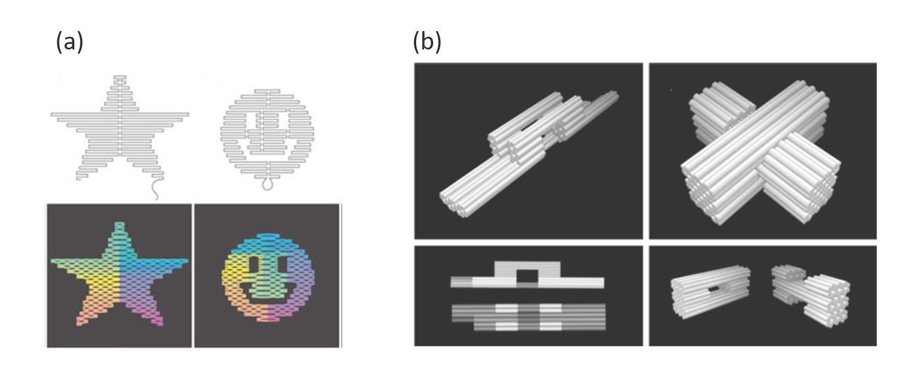 Figure 2.Examples of DNA origami in nanoscale structures. (a) A long single-stranded DNA folds into desired shapes, and different sets of the “staple” strands favor the construction of these well-designed shapes such as star and smiley face. Adapted from ref 8. (b) Honeycomb-pleated DNA origami in the deliberately designed shape of railed bridge and slotted cross, formed by folding a viral DNA strand. Adapted from ref 9.