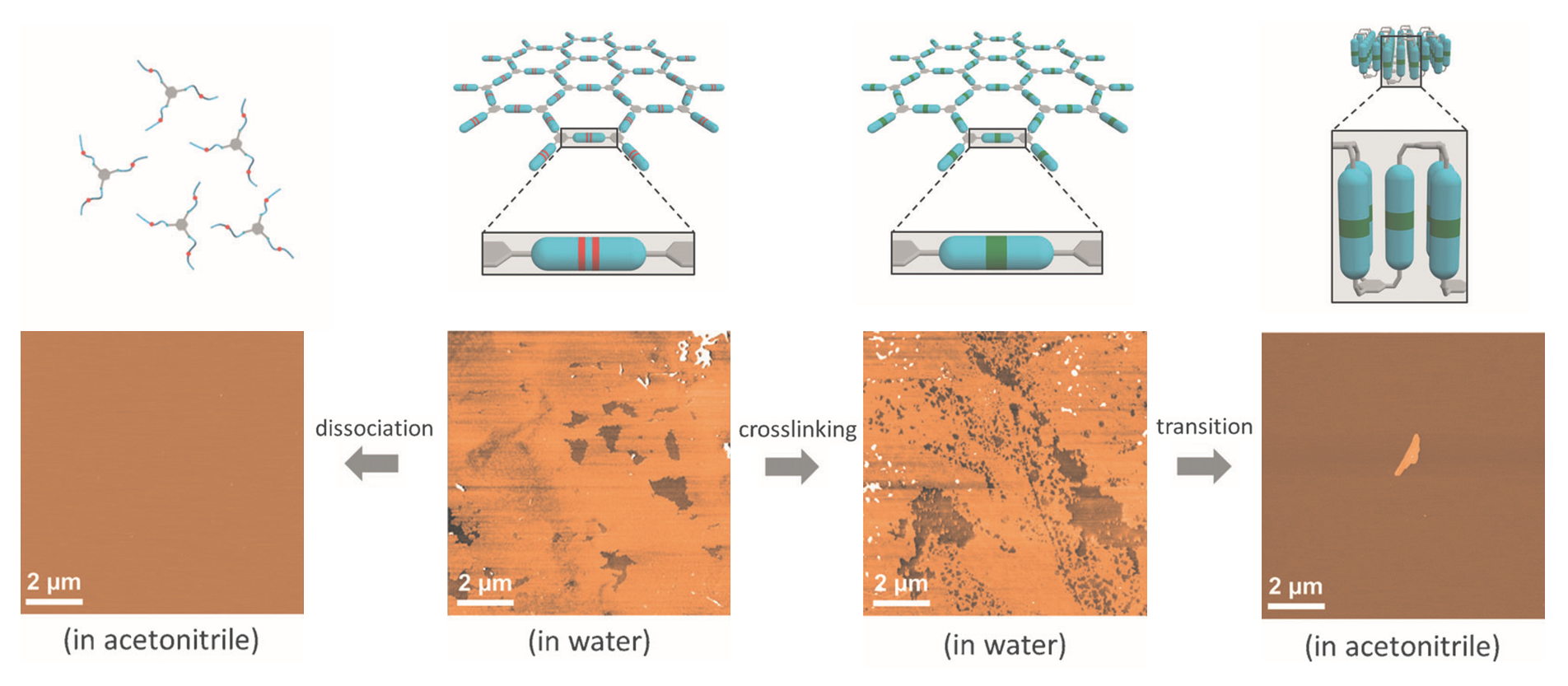 Figure 4. The thin sheets formed by hybridization of self-complementary tris-oligonucleotides disassembled when dissociated and dissolved in acetonitrile, while the covalently crosslinked sheets underwent transition into thick pads under the same condition, demonstrated by AFM. Adapted from ref 13.