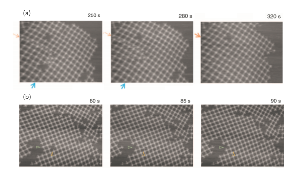 Figure 3. HS-AFM visualized (a) the self-error-correction and (b) the defects filling of DNA supramolecular structures. Adapted from ref 11.