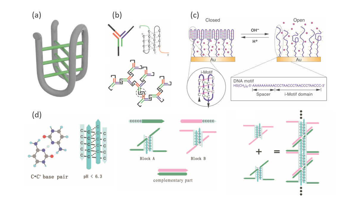 Figure 8. (a) The 3D structure of i-motif, hydrogen bonds between C: C+ marked in green. (b) Principle structure of a DNA hydrogel made through the three-dimensional assembly of the Y units. Two black domains from neighboring DNA Y units form an i-motif to cross-link adjacent Y units. Adapted from ref 25. (c) Working principle of the switching DNA nanocontainer. The four-stranded i-motif structures formed at pH 4.5 block the small molecules marked in purple. They transform into single strands at pH 8 and become loose enough to allow free diffusion. Adapted from ref 26. (d) Model of the DNA self-assembly process, via the formation of i-motif. Adapted from ref 27.