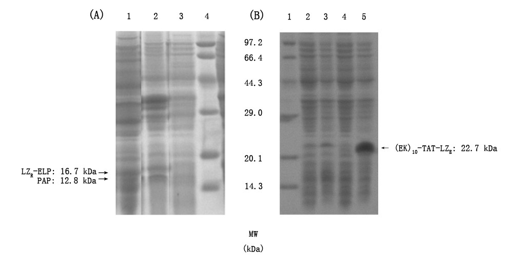 Figrue2. Induced expression and soluble analysis of LZR-ELP, PAP and (EK)10-TAT-LZE. a) determination expression form of LZR-ELP. Lanes1, supernatant and lanes2, precipitant obtained from induced bacteria; lanes3: bacteria liquid sample before induction; lanes4: Premixed Protein Marker (broad). b) determination expression form of (EK)10-TAT-LZE, lanes1: Premixed Protein Marker (broad); lanes2: precipitation obtained from induced bacteria; lanes3: bacteria liquid sample after induction; lanes4: bacteria liquid sample before induction and lanes5: supernatant obtained from induced bacterial.