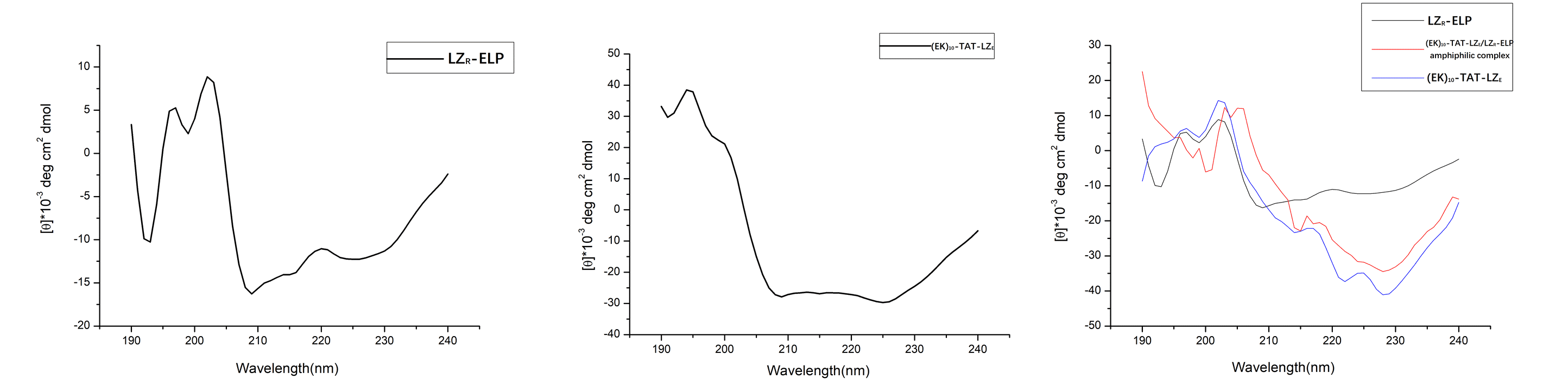 Figure4. (A) CD spectra of LZR-ELP (2×10-5 M). (B) CD spectra of (EK)10-TAT-LZE. (C) LZR-ELP (2×10-5 M) and (EK)10-TAT-LZE (2×10-5 M) assembled at pH=7.