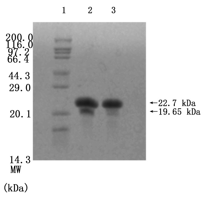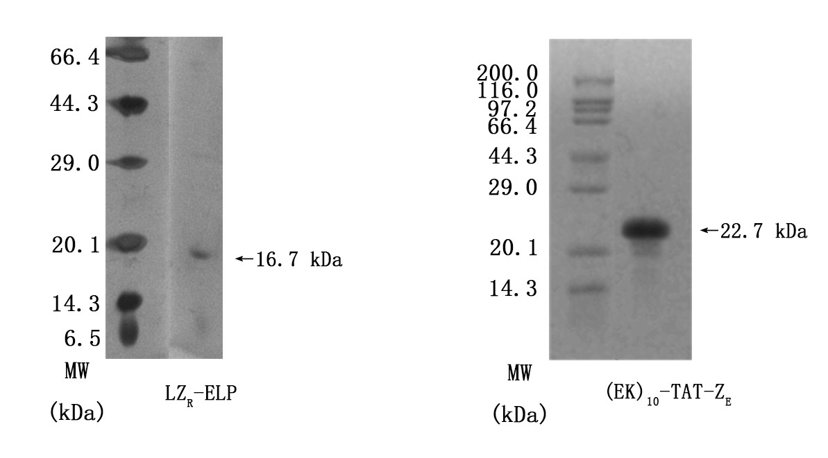 Figrue3. SDS-PAGE results of determining purities of LZR-ELP and (EK)10-TAT-LZE. Lanes1 and 2 were Premixed Protein Marker and target protein respectively.