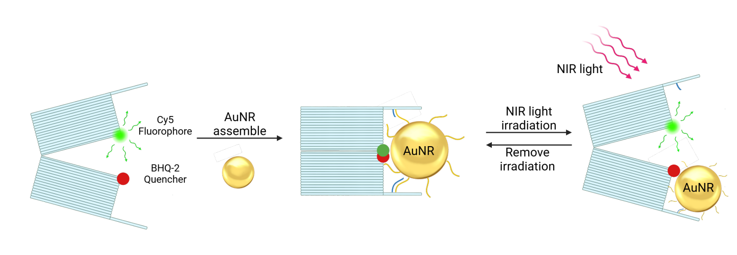 Overview: We modified the upper and lower layers of the DNA origami with Cy5 fluorophore and BHQ-2 quencher. When the DNA origami is not conjugated with gold nanorods or exposed to near-infrared light, it exhibits fluorescence. However, upon conjugation with gold nanorods and closure, the fluorescence is quenched. We employed a fluorescence spectrometer to detect the fluorescence of the DNA origami.