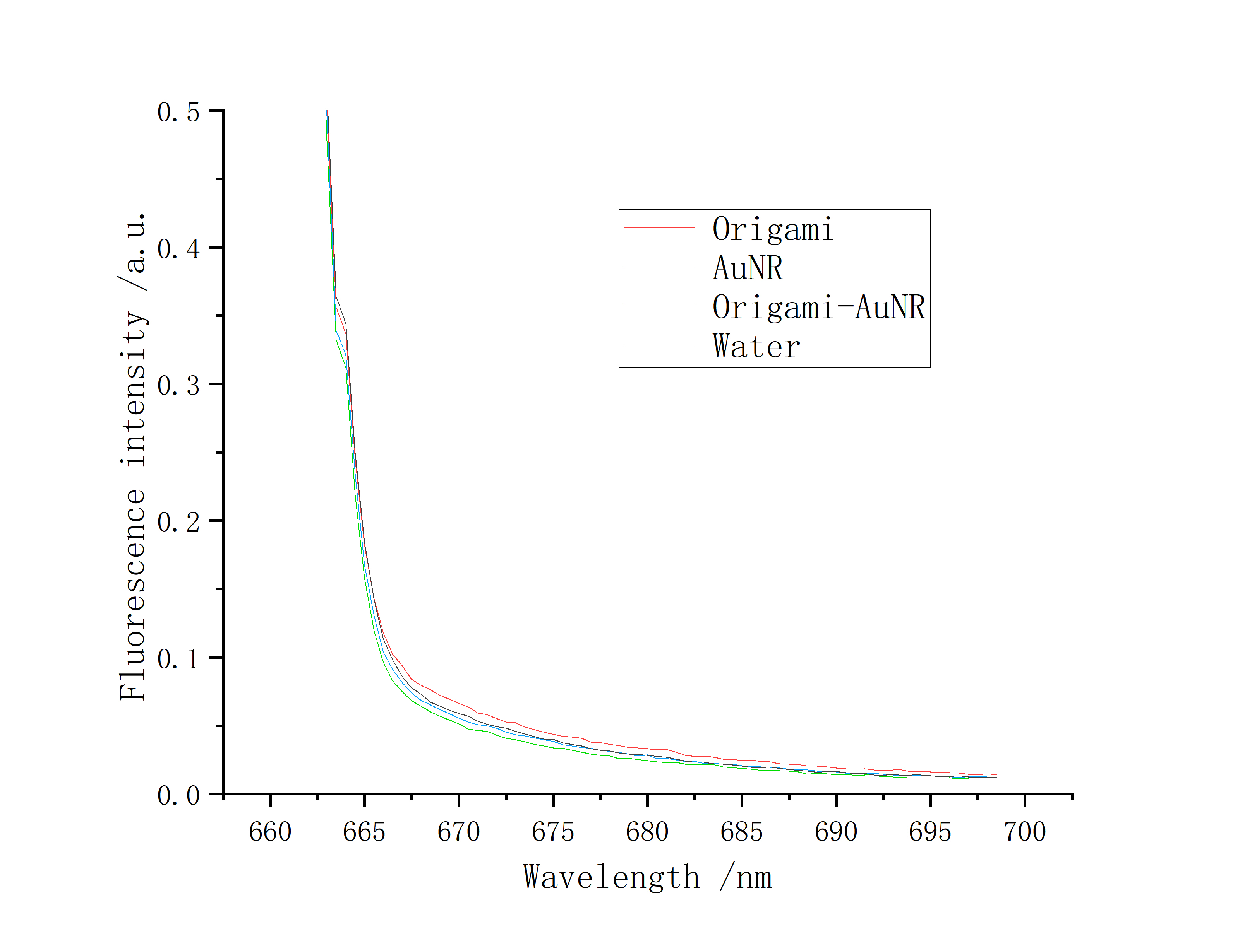 In this experiment, the DNA origami and DNA origami-AuNR assembly were prepared at a concentration of 12 nM. We observed that the DNA origami exhibited a distinct fluorescence peak, while the DNA origami-AuNR assembly showed no fluorescence, indicating that the assembly of AuNRs led to the closure of the DNA origami structure, resulting in fluorescence quenching. We utilized a fluorescence spectrometer to detect the fluorescence of the DNA origami.