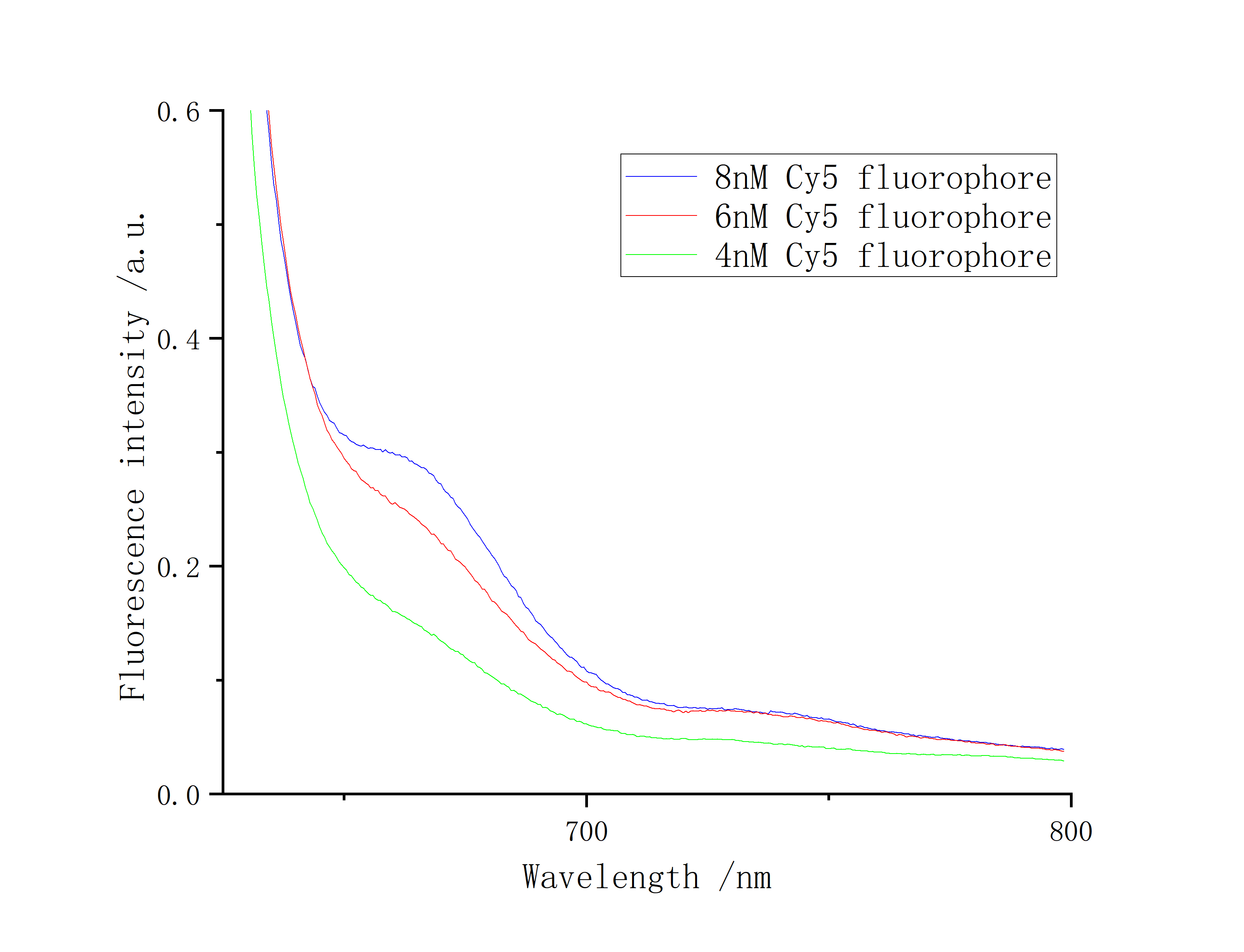 We observed that DNA origami conjugated with Cy5 fluorescent dye did not exhibit fluorescence. We performed a NanoDrop assay on the sample and calculated the DNA origami concentration to be only 3 nM. We attributed the absence of a detectable fluorescence signal in the fluorescence spectrometer to the low concentration of the sample. Consequently, we decided to conduct concentration tests with the fluorescent dye to determine the lowest concentration capable of emitting a detectable fluorescence signal.