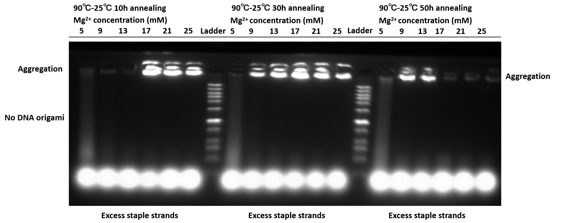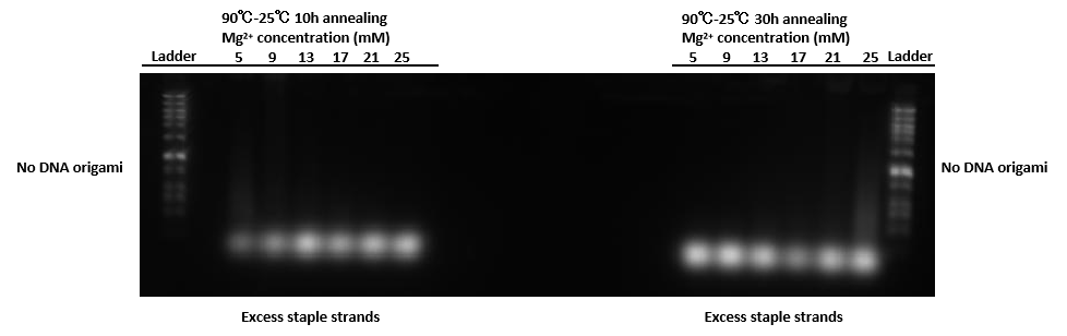 We have observed an absence of DNA origami bands, which we hypothesize may be attributed to the insufficient annealing time of 10 hours and 30 hours, potentially inadequate for the proper folding of DNA origami structures. Consequently, we have decided to extend the annealing time to enhance the likelihood of achieving correctly folded DNA origami.
