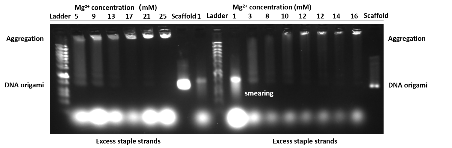 Upon setting the Mg2+ concentration to 1 mM, a distinct DNA origami band was observed, signifying the successful folding of the DNA origami. Nevertheless, the trailing effect adjacent to the band suggests the presence of incompletely formed DNA origami. Aggregation phenomena were noted under alternative Mg2+ conditions. Therefore, we have resolved to refine the concentration used for the folding of DNA origami and to further diminish the Mg2+ ion concentration within the TAE buffer and agarose gel to mitigate these issues.