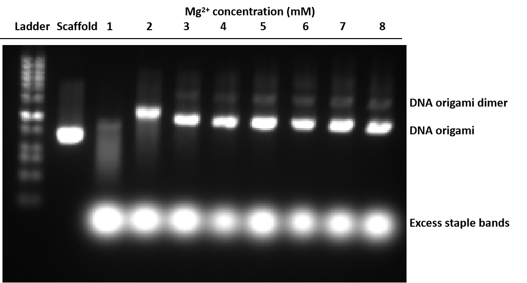 The DNA origami has been successfully folded, as evidenced by a highly distinct band. The presence of some dimers has been observed, which, according to literature review, is a common occurrence. We have determined that a Mg2+ concentration of 4 mM is the optimal condition for the synthesis of DNA origami and will utilize this concentration in forthcoming folding experiments.