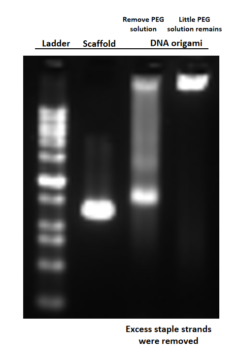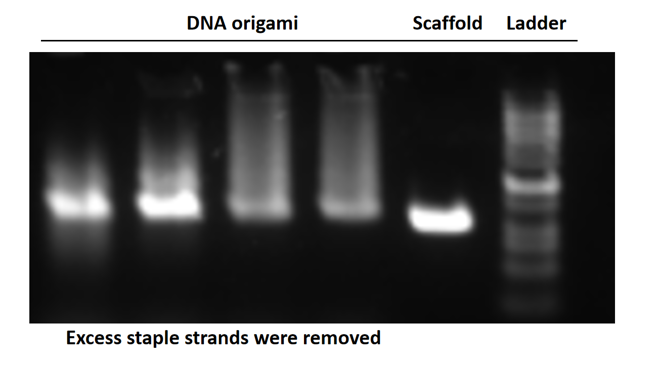 Based on our previous experience, we purified the origami again, successfully removing the excess staple strands this time, and obtained high concentration of DNA origami.