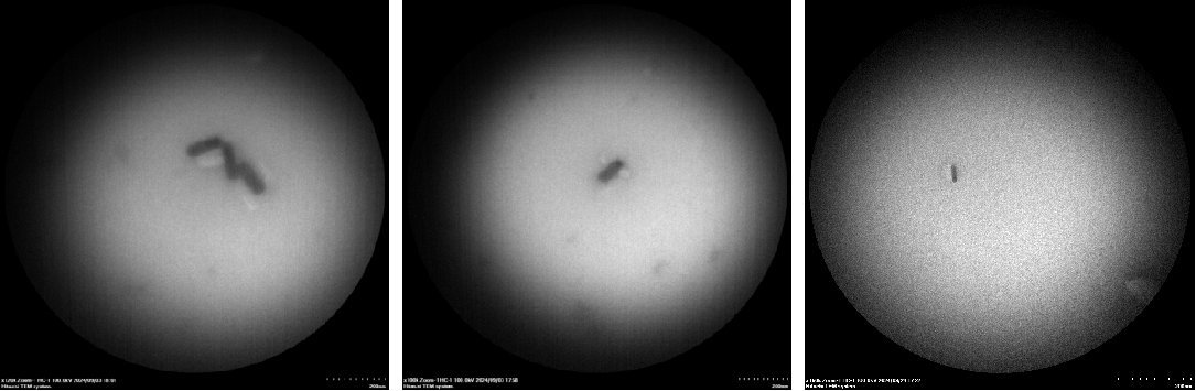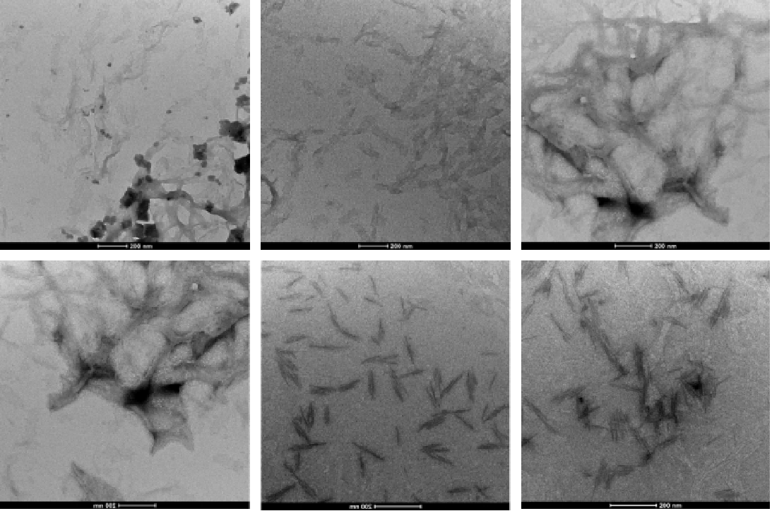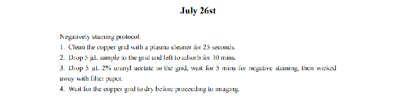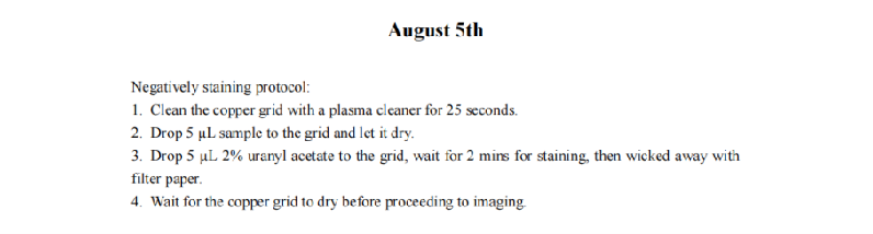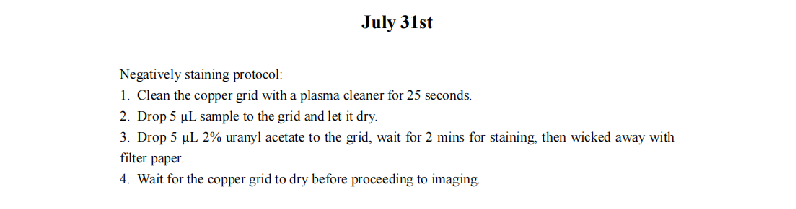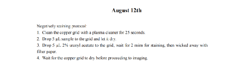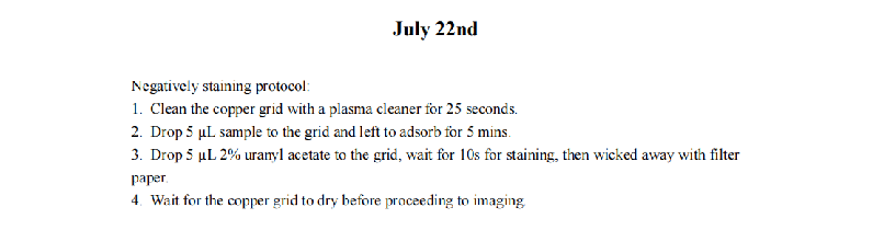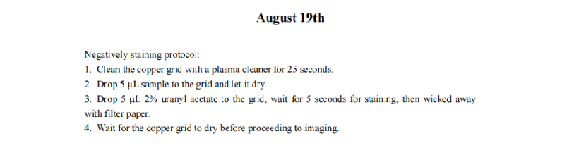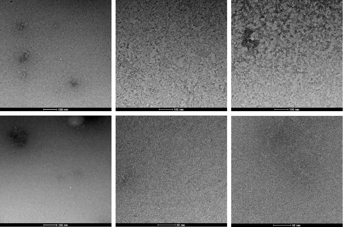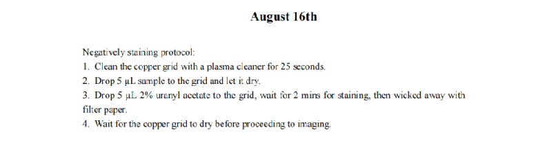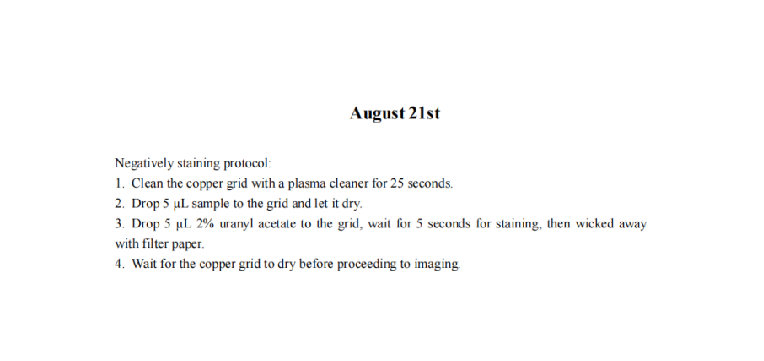 We increased the staining time of DNA origami and the absorption time in hopes of achieving a clearer contour of the DNA origami. We also reduced the concentration of Mg2+ during the folding and purification of DNA origami to minimize aggregation. However, the TEM results revealed that the samples exhibited an entangled fibrous structure. Even when individual nanoparticles were present, their morphology significantly deviated from the designed morphology of our DNA origami. Additionally, a large number of black spots appeared in the field of view, which we attribute to over-staining. Consequently, we have decided to refine the purification protocol for DNA origami until significant aggregation is no longer observed and reconstitute the negative staining agent, and substantially reduce the duration of negative staining.