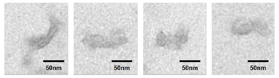 We have successfully characterized the structure of DNA origami using TEM. The results reveal that the shape and size of the DNA origami are in accordance with expectations, and a high number of DNA origami structures are visible within the same field of view. However, the presence of the negative staining agent results in some blurring of the DNA origami contours. We plan to recharacterize the DNA origami using a protocol that does not involve negative staining.