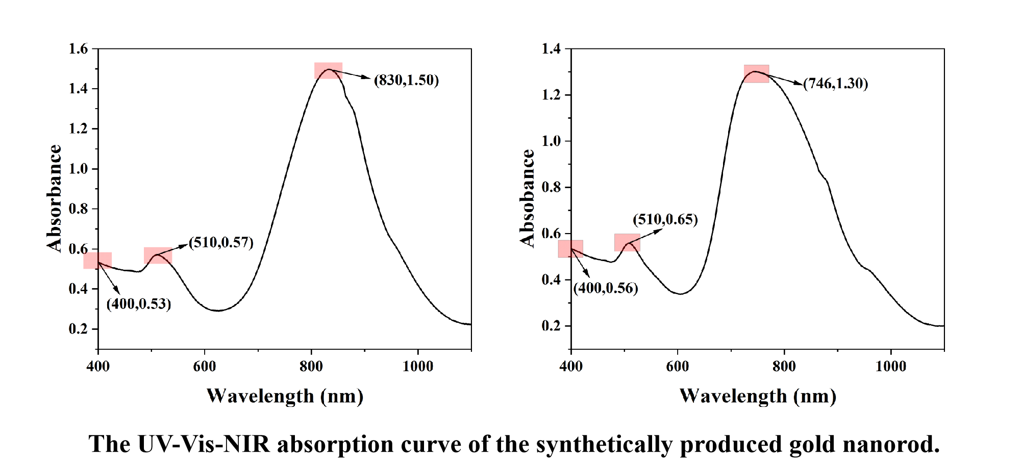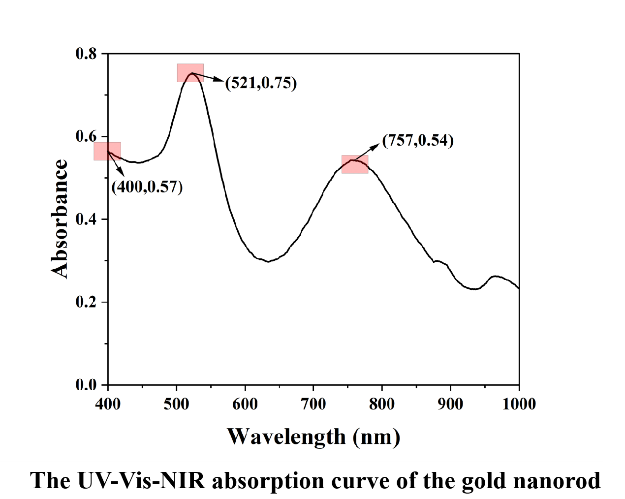 After the re-growth of the gold nanorods, the color of the solution was darker. Subsequently, 100 µL of this gold nanorod solution was withdrawn, diluted ten fold, transferred to a cuvette, and the UV-Vis-NIR absorption was monitored. The data obtained were organized and plotted as follows: