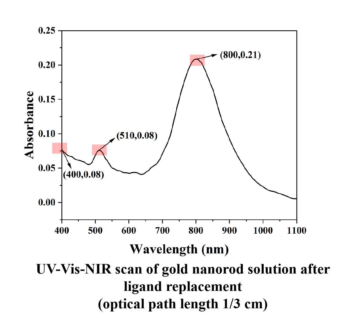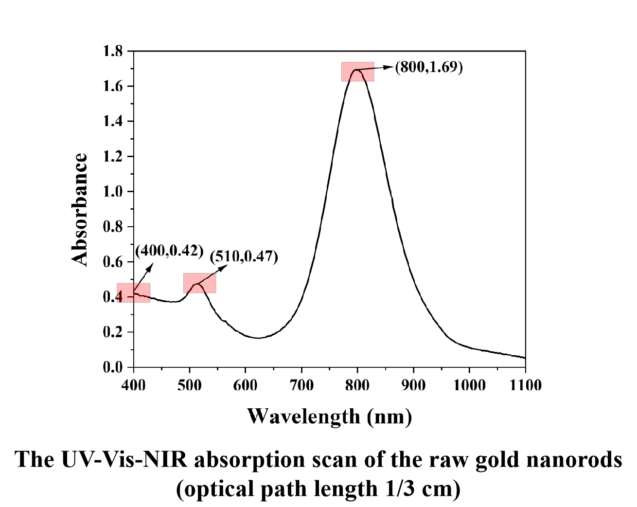 The full band scan of gold nanorods is shown above.The absorption peak positions are located at 510 nm and 800 nm.