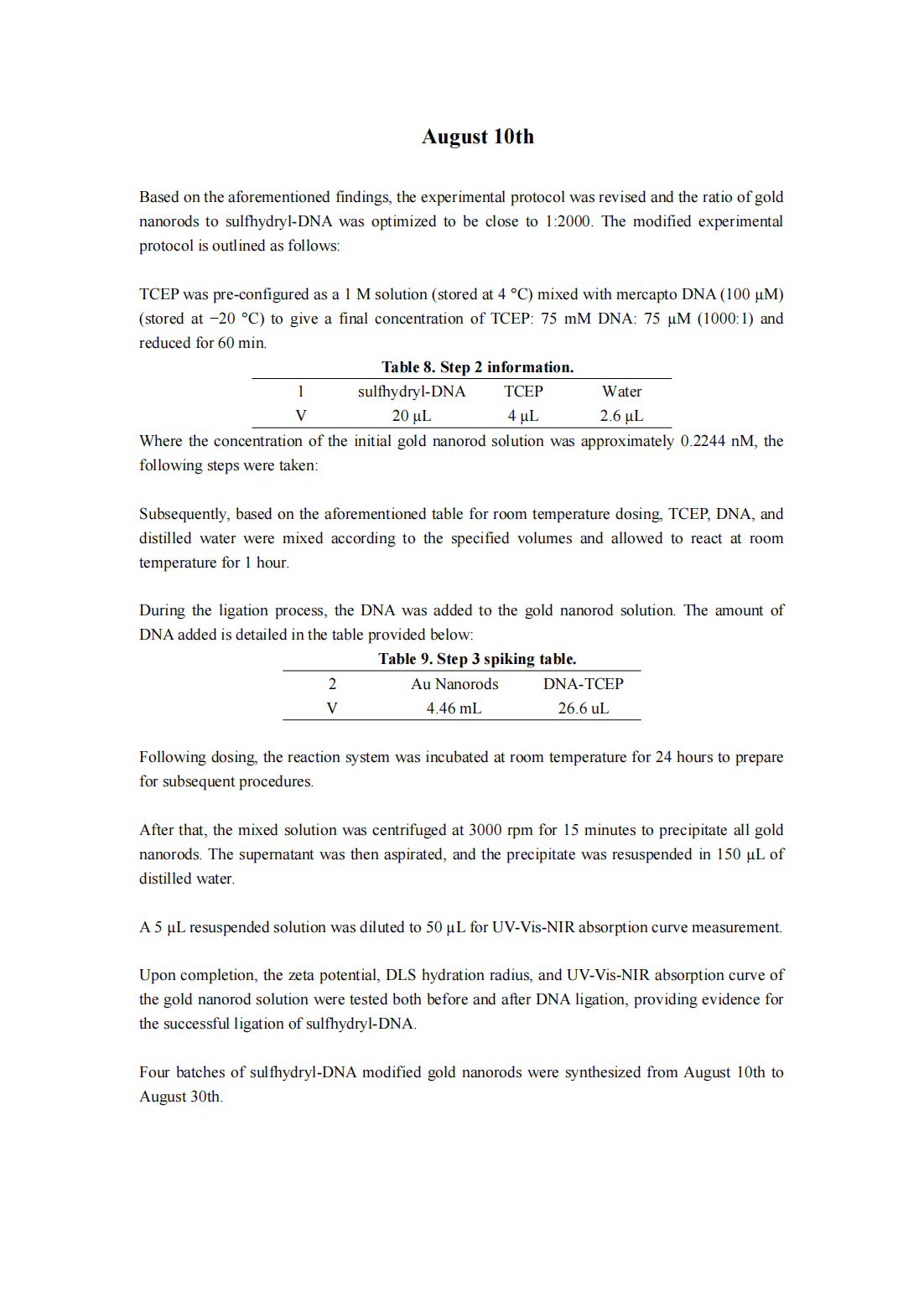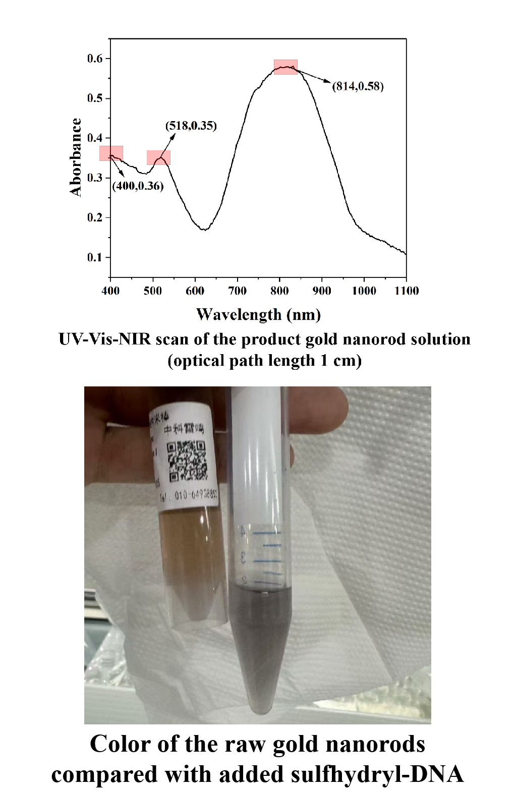 In summary of the aforementioned experiments, we successfully completed the synthesis of gold nanorods and the surface modification with sulfhydryl-DNA. Furthermore, we summarized and explored the standard experimental protocols, establishing a foundation for the subsequent binding of sulfhydryl-DNA modified gold nanorods to DNA-origami.