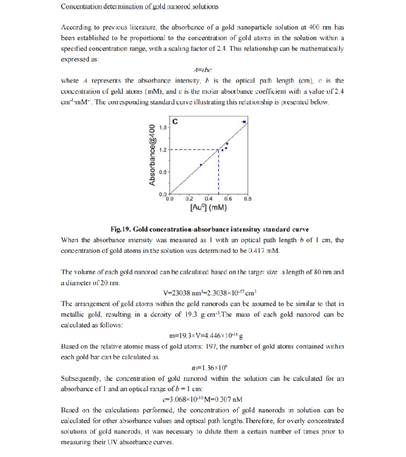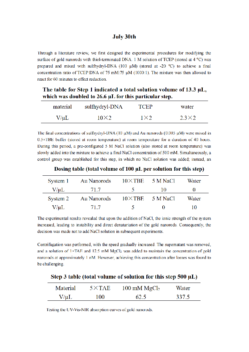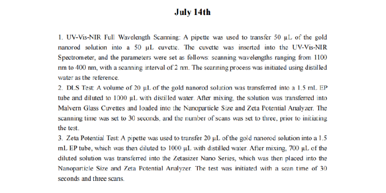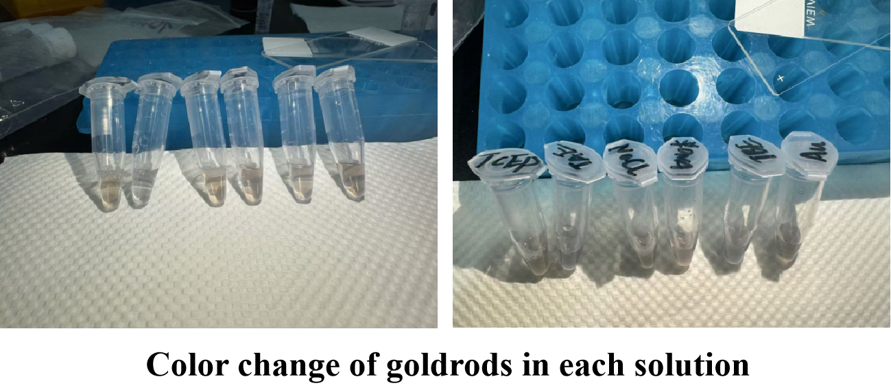 Given the inherent challenges in precisely controlling the synthesis size of gold nanorods, it was determined to be impractical to achieve gold nanorods with an optimal absorption peak at 800 nm, a length of 80 nm, and a diameter of 20 nm. Moreover, considering that variations in rod size had minimal impact on subsequent surface modifications, such as ligand exchange and sulfhydryl-DNA modification, we made a decision to go ahead with the gold nanorods we made to get familiar with the whole experiment.Furthermore, recognizing the limitation in synthesizing gold nanorods compared with the size we want, we decided to buy gold nanorods which have a more precise particle size and a more uniform particle size distribution for subsequent experiments which can further enhance the quality of the experimental outcomes.