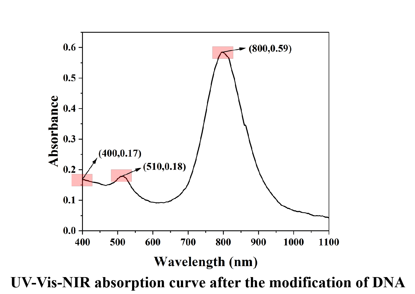 We conducted the modification of sulfhydryl-DNA onto the surface of gold nanorods and subsequently concentrated the product. After the concentration, an aliquot was withdrawn and diluted 20-fold for the purpose of assessing its absorption curve, as illustrated in Figure 16.Based on the data presented in Figure 16, the concentration of the product gold nanorods was calculated to be 1.04 nM (representing a 20-fold concentration of the tested sample). Notably, there was no changes in the absorption peak positions or peak shapes, indicating that the gold nanorods did not undergo aggregation and denaturation. Furthermore, the ratio of the primary to secondary peak heights ranged between 3 and 4, which is indicative of the high quality of the produced gold nanorods.