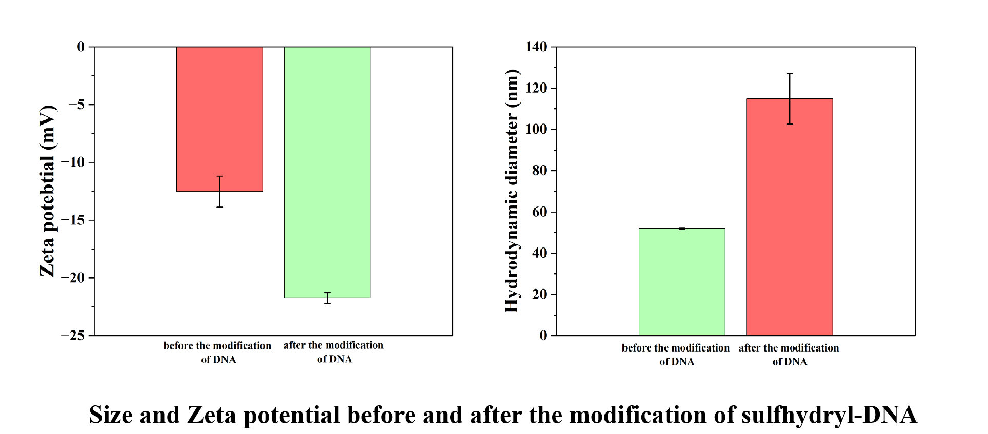 The hydration radius of the gold nanorods increased after the modification of sulfhydryl-DNA, and a change in the Zeta potential on their surface was observed, thereby providing evidence for the successful modification of sulfhydryl-DNA.