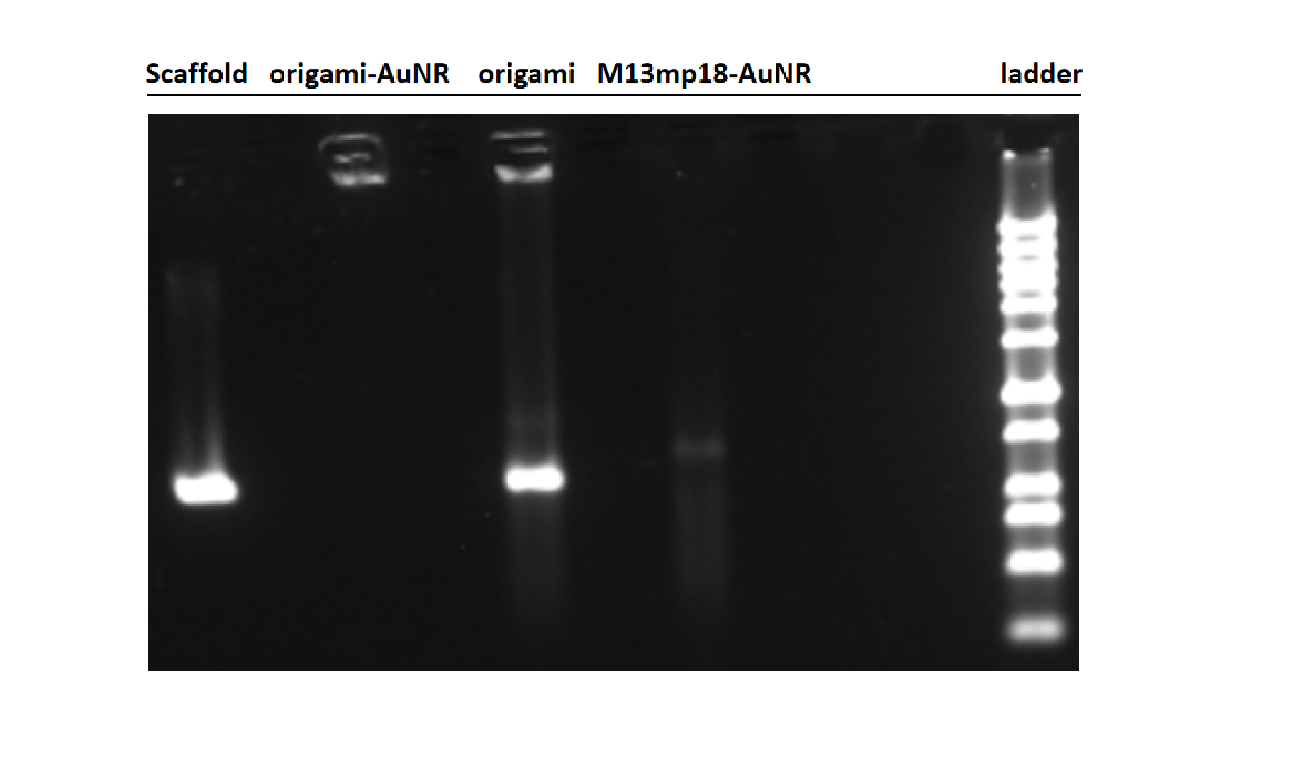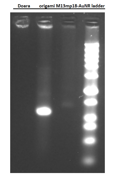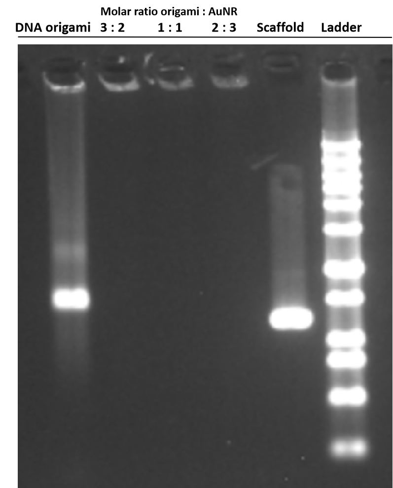 We employed PCR instrument to facilitate the assembly of DNA origami and AuNR. Given the significantly higher molecular weight of AuNR (approximately 50 times that of the DNA origami), blockage of the sample wells was observed during agarose gel electrophoresis following successful assembly with DNA origami. The electrophoresis results confirmed the successful assembly of DNA origami with AuNR. However, subsequent TEM characterization revealed a limited number of suitable assemblies within the same field of view. We posit that the abbreviated annealing time and low concentration of sample have resulted in inadequate assembly. Consequently, we have decided to modify the assembly annealing procedure and reattempt the assembly process.