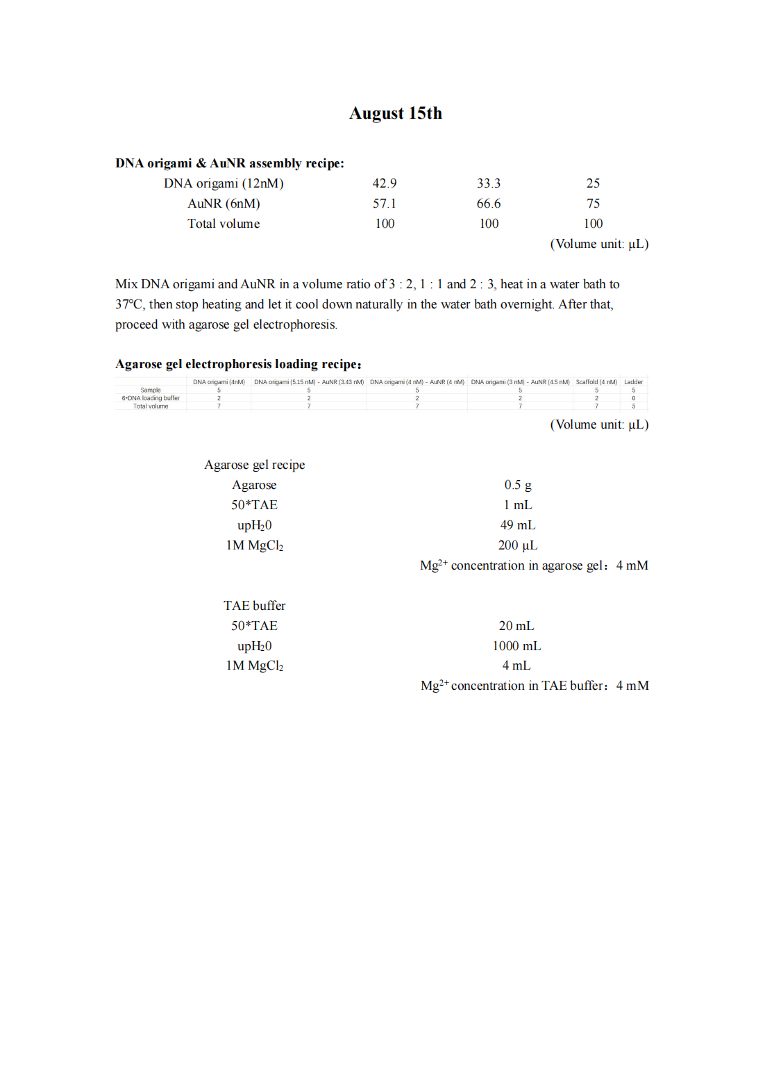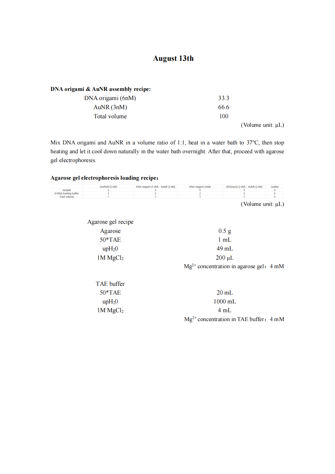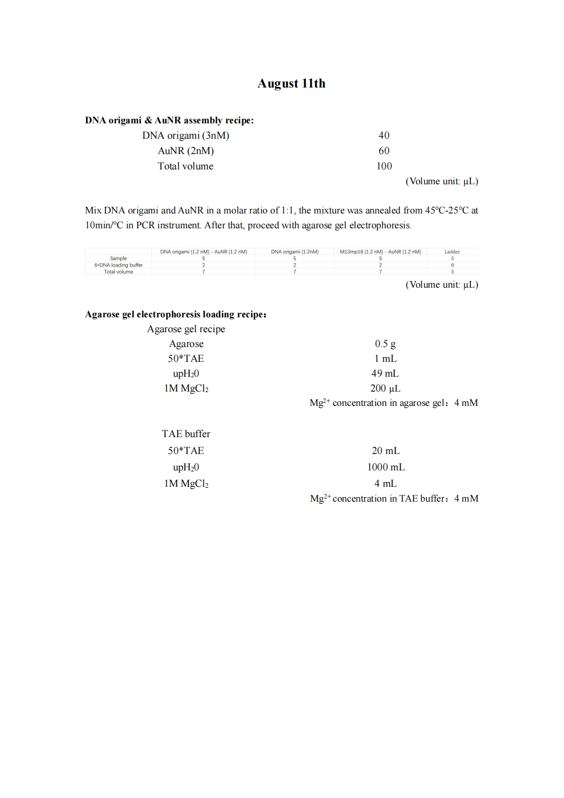 Despite increasing the annealing time to 50 hours, we have not been able to observe the DNA origami band, leading us to suspect that the current annealing procedure may not be compatible with our origami design. Additionally, we have noticed a bright sample well, which we hypothesize may be due to DNA aggregation caused by the high concentration of Mg2+ in the TAE buffer and agarose gel. Consequently, we have decided to modify the annealing protocol and reduce the Mg2+ concentration in both the TAE buffer and agarose gel to mitigate this issue.