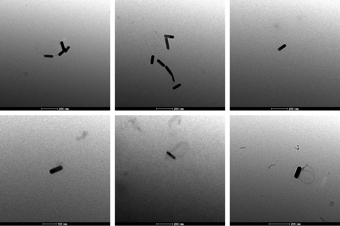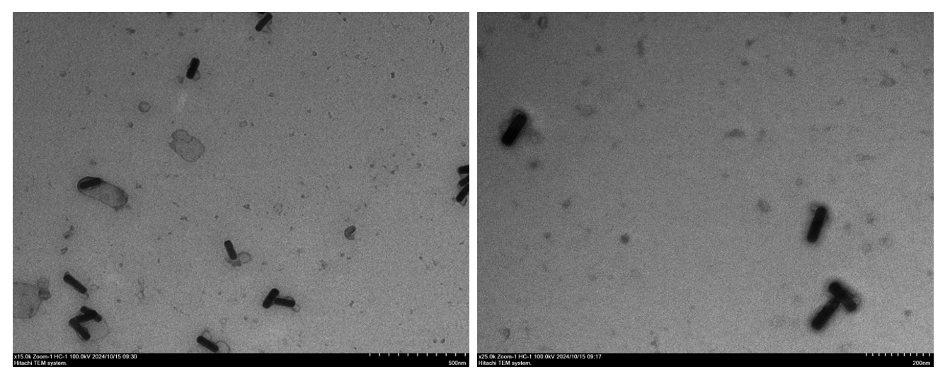 Consistent with the previous experiment, no DNA origami was observed to be conjugated to AuNR under TEM, and we noted a limited number of nanoparticles in the field of view. We have decided to increase the concentrations of both AuNR and DNA origami and repeat the experiment.