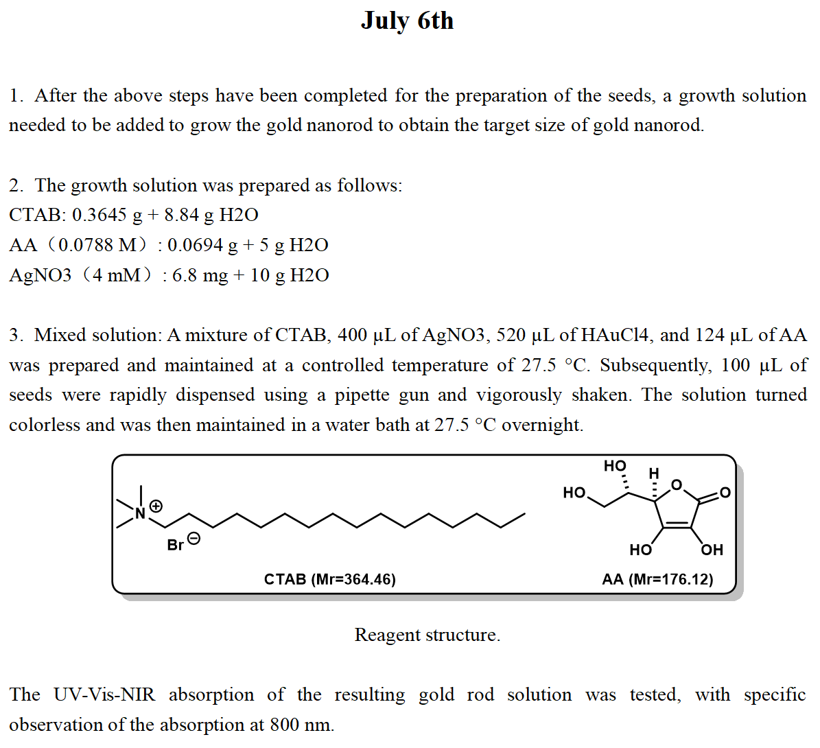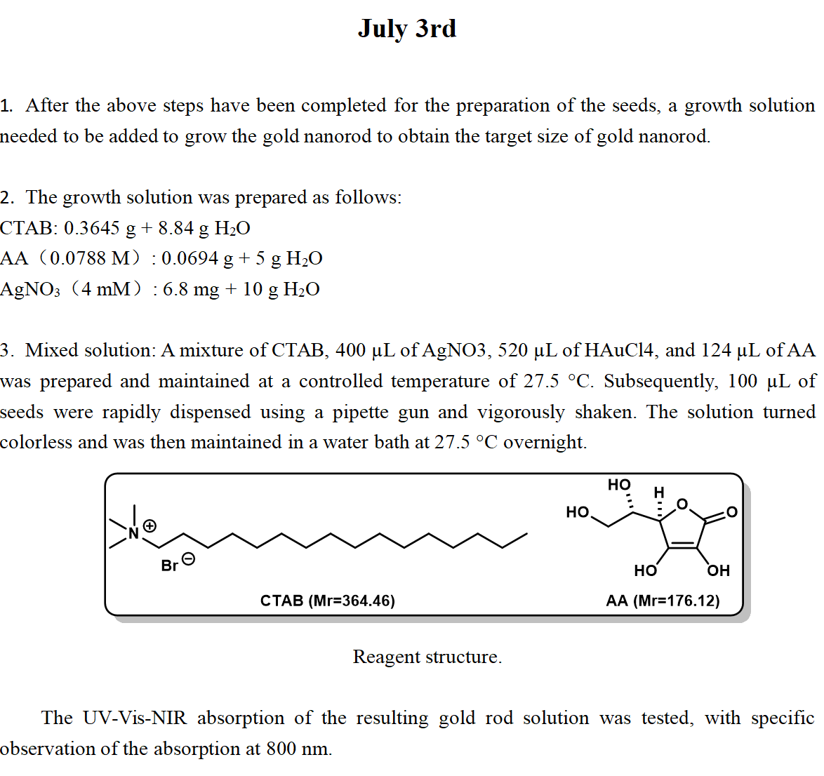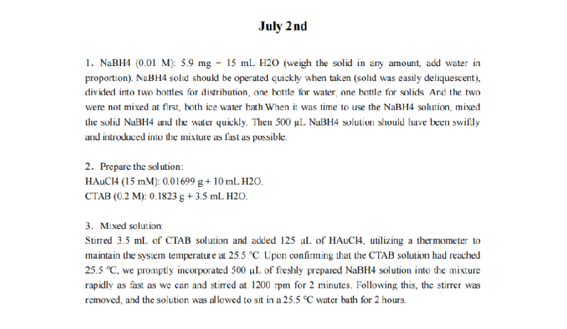 Three sets of gold nanorod were synthesized in parallel, and it was found that the color of this synthesized gold nanorod was too light and differed from the reasonable color compared with the colour showed in the literature, so the synthesis failed and the experimental operation needed to be improved.