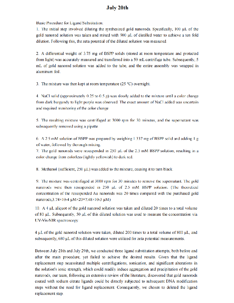 Based on the changes observed in the zeta potential before and after the process, it could be concluded that the ligand substitution was successful. However, it was noted that the concentration of the product obtained after concentration was not significant. It was hypothesized that during the procedure, a color change from orange to blue-violet occurred in the gold nanorods. Due to the subsequent increase in ionic strength within the solution, the stability of the gold nanorods was decreased, leading to the aggregation and denaturation. Consequently, a greater loss of gold nanorods was occured. Therefore, these steps should be avoided during the ligand exchange process.Between 0825 and 0915, we conducted three ligand substitution attempts, both before and after the main procedure, yet failed to achieve the desired results. Given that the ligand replacement step necessitated multiple centrifugations, sonication, and significant alterations in the solution's ionic strength, which could readily induce aggregation and precipitation of the gold nanorods, our team, following an extensive review of the literature, discovered that gold nanorods coated with sodium citrate ligands could be directly subjected to subsequent DNA modification steps without the need for ligand replacement. Consequently, we chosen to deleted the ligand replacement step.