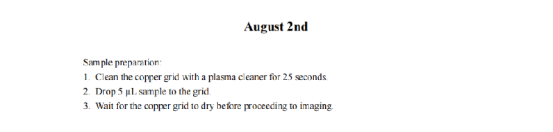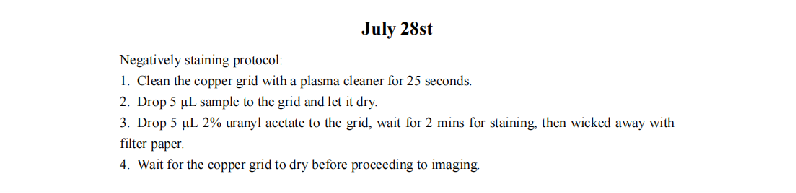 After adjusting the staining and purification protocols for DNA origami, we have achieved clearer outline of the DNA origami structure under TEM. However, the concentration of nanoparticles remains low. Therefore, we have decided to modify the sample preparation method for TEM from adsorbing 10 minutes to lefting the samples to dry before staining.