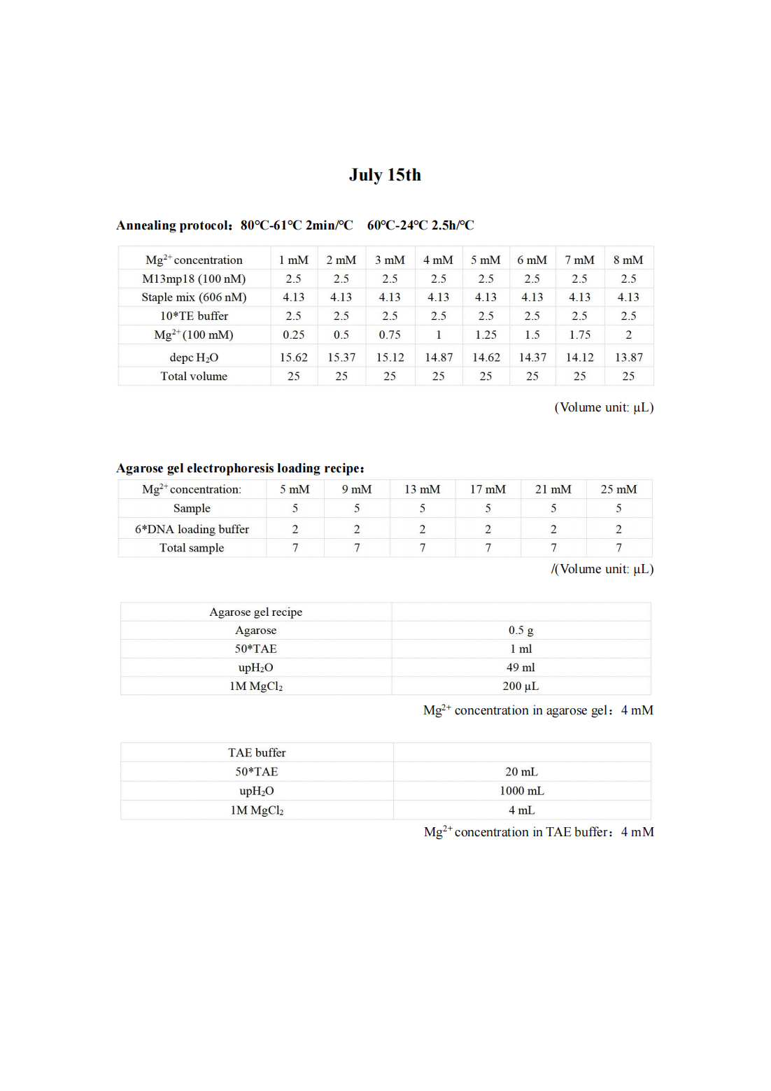 After modifying the annealing protocol, DNA origami bands have become visible; however, a majority of the structures are in a polydisperse state. We hypothesize that the elevated Mg2+ concentration within the DNA origami sample may be responsible for this issue. Consequently, we intend to explore a DNA origami folding protocol with varying Mg2+ concentrations, ranging from 1-4 mM, to optimize the folding conditions.